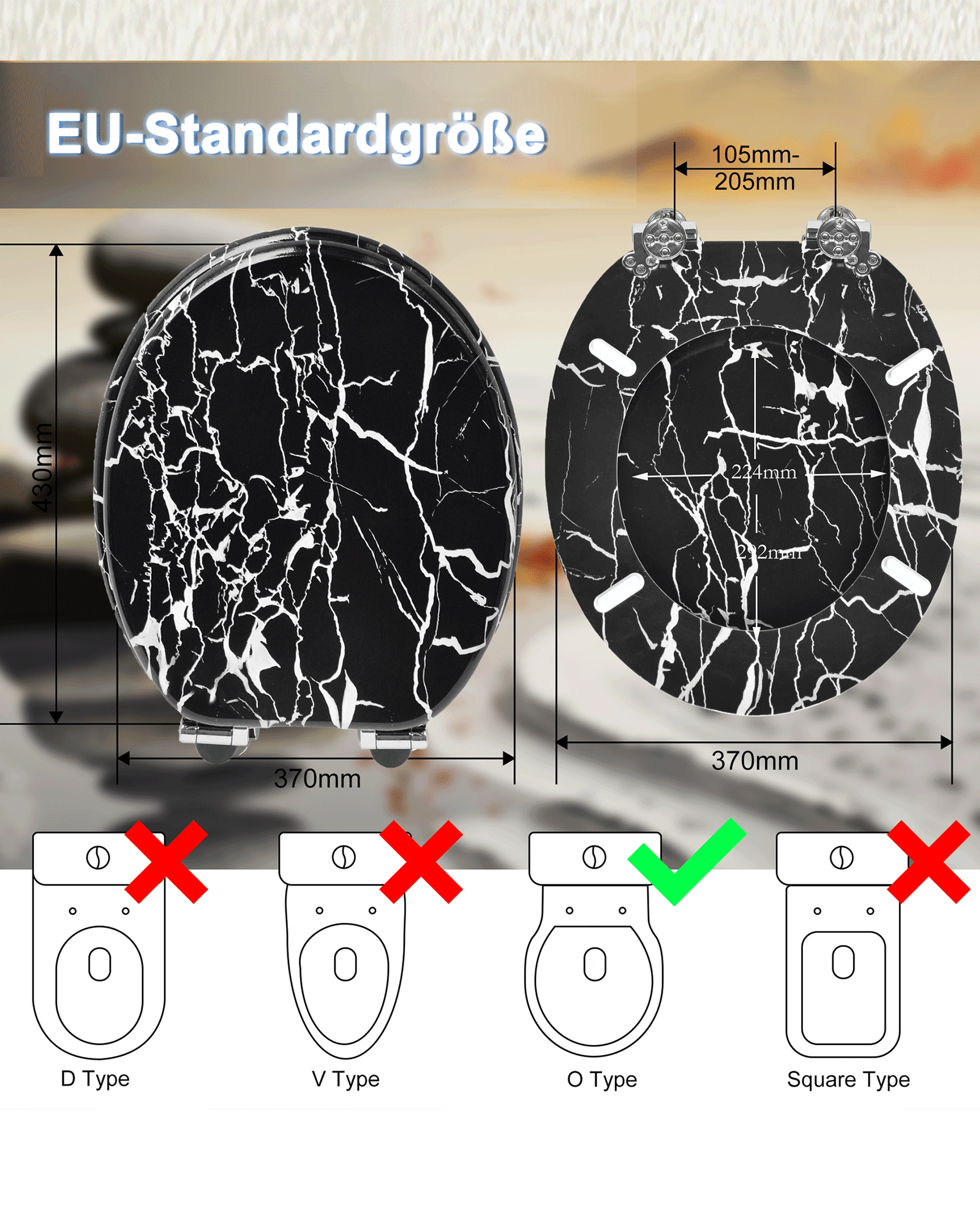 Ein gutes Toilettenerlebnis kann uns helfen, uns im Leben besser zu fühlen. Die Benutzung von Toiletten bringt viel Bequemlichkeit und Komfort in unser Toilettenleben. Aber es gibt auch viele Probleme, wie zum Beispiel: Toilettendeckel sind leicht mit Bakterien behaftet, die unsere Gesundheit ernsthaft beeinträchtigen. Aus Umweltschutz- und Gesundheitsgründen sollten wir unsere Toiletten häufig austauschen. Die Kosten für den Austausch von Toiletten sind jedoch relativ hoch und die Verfahren sind komplizierter. Dies hat vielen Familien große Probleme bereitet. SINOBATH geht von den Bedürfnissen jedes Kunden aus. Seit mehr als zehn Jahren engagieren wir uns für die Forschung und Entwicklung sowie die Produktion von Toilettendeckeln. Lassen Sie unsere Kunden die Probleme der Bakterienvermehrung auf Toilettendeckeln rechtzeitig lösen, ohne die Toilette austauschen zu müssen. Unser austauschbarer Toilettendeckel ist Ihre beste Wahl. Mit einer Puffervorrichtung gibt es kein störendes Quietschgeräusch; spezielle PVC-Folie zur Reduzierung des Bakterienwachstums; MDF-Holzmaterial, sicher und zuverlässig. Gleichzeitig haben wir viele Muster für Sie zur Auswahl, damit Ihre Toilette nicht mehr eintönig ist!
