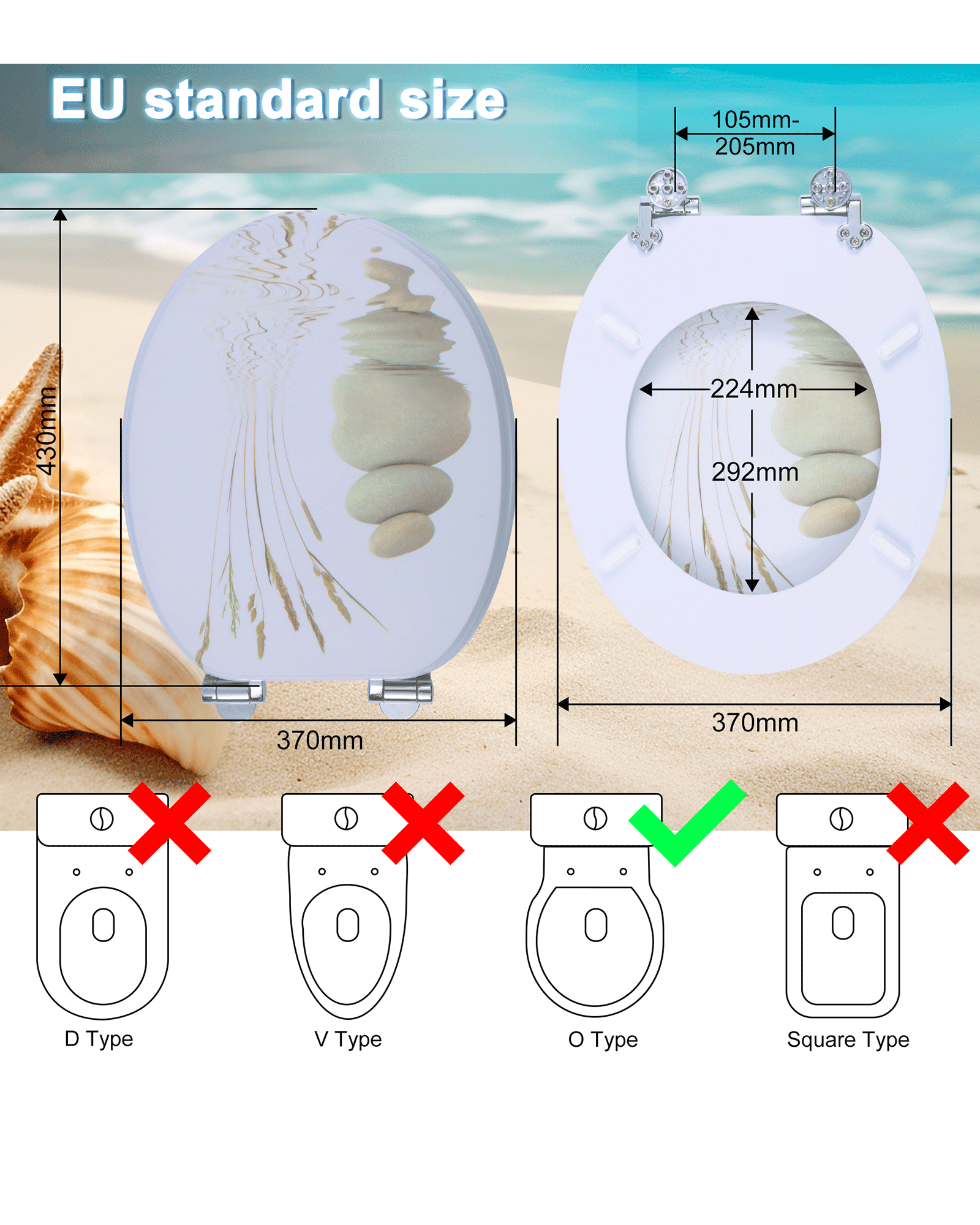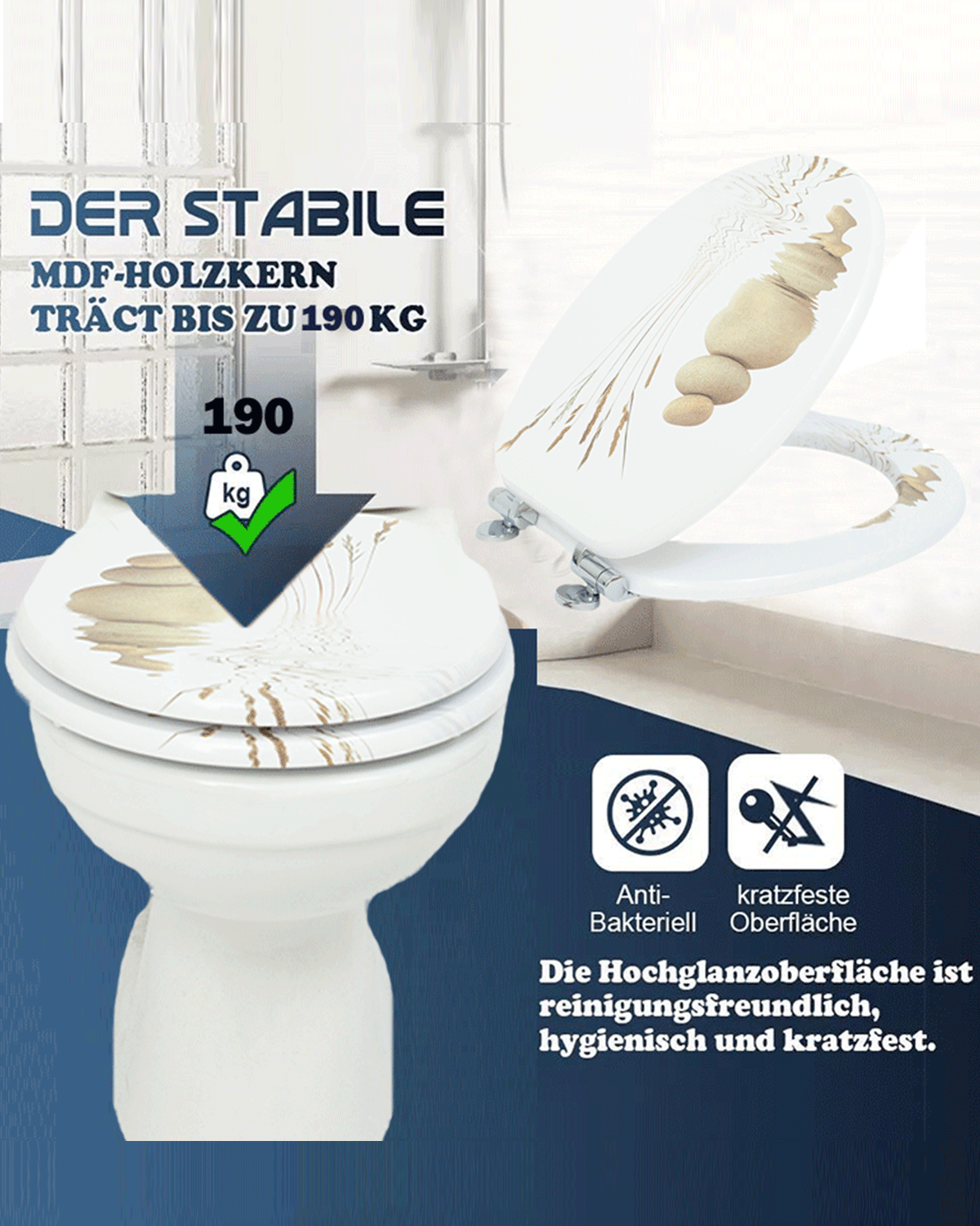 Ein gutes Toilettenerlebnis kann uns helfen, uns im Leben besser zu fühlen. Die Benutzung von Toiletten bringt viel Bequemlichkeit und Komfort in unser Toilettenleben. Aber es gibt auch viele Probleme, wie zum Beispiel: Toilettendeckel sind leicht mit Bakterien behaftet, die unsere Gesundheit ernsthaft beeinträchtigen. Aus Umweltschutz- und Gesundheitsgründen sollten wir unsere Toiletten häufig austauschen. Die Kosten für den Austausch von Toiletten sind jedoch relativ hoch und die Verfahren sind komplizierter. Dies hat vielen Familien große Probleme bereitet. SINOBATH geht von den Bedürfnissen jedes Kunden aus. Seit mehr als zehn Jahren engagieren wir uns für die Forschung und Entwicklung sowie die Produktion von Toilettendeckeln. Lassen Sie unsere Kunden die Probleme der Bakterienvermehrung auf Toilettendeckeln rechtzeitig lösen, ohne die Toilette austauschen zu müssen. Unser austauschbarer Toilettendeckel ist Ihre beste Wahl. Mit einer Puffervorrichtung gibt es kein störendes Quietschgeräusch; spezielle PVC-Folie zur Reduzierung des Bakterienwachstums; MDF-Holzmaterial, sicher und zuverlässig. Gleichzeitig haben wir viele Muster für Sie zur Auswahl, damit Ihre Toilette nicht mehr eintönig ist!